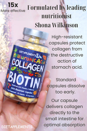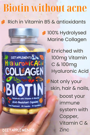 In addition to marine collagen capsules, this powerful formula also includes Biotin 10,000mcg, a potent vitamin that helps strengthen hair and nails, promoting thicker, shinier hair and healthier nails. Hyaluronic Acid is included to help promote hydration and smooth, glowing skin, making this supplement the perfect addition to your beauty and health routine.