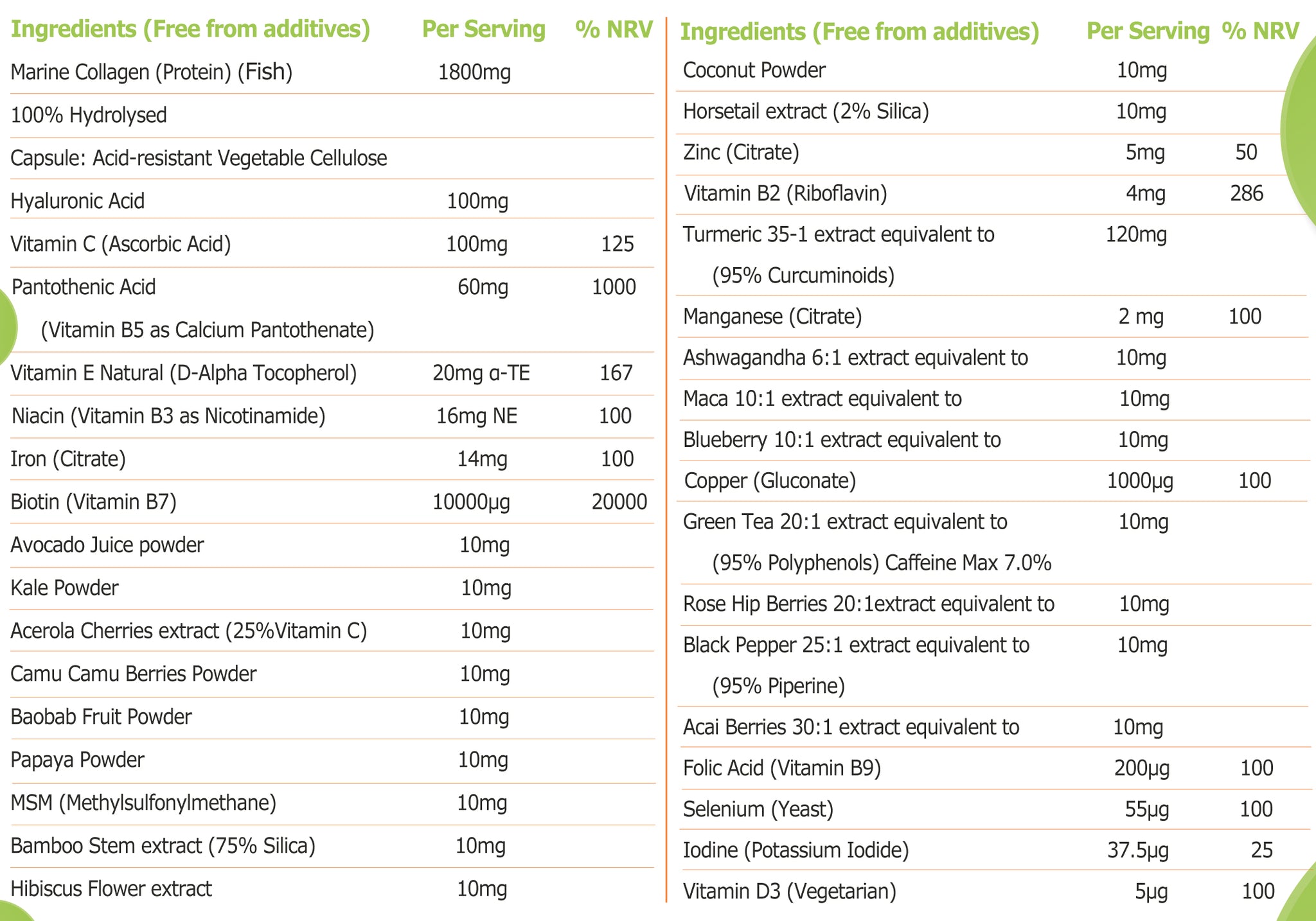 | Marine Collagen (Protein) (Fish) Type 1 & 3 - 100% Hydrolysed | 1800mg | |